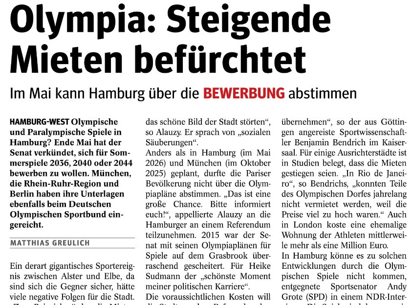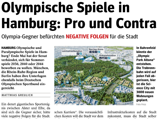 Jetzt im August greift das Hamburger Wochenblatt in seinen unterschiedlichen Ausgaben das Thema auf. Einmal titelt das Anzeigenblatt mit hoher Auflage ein Pro und Contra. In einer anderen Ausgabe des Elbe Wochenblatts heißt es: „Olympia: Steigende Mieten befürchtet.“Die eine Variante vom Hamburger bzw. Elbe Wochenblatt ist hier Online. Die andere hier.